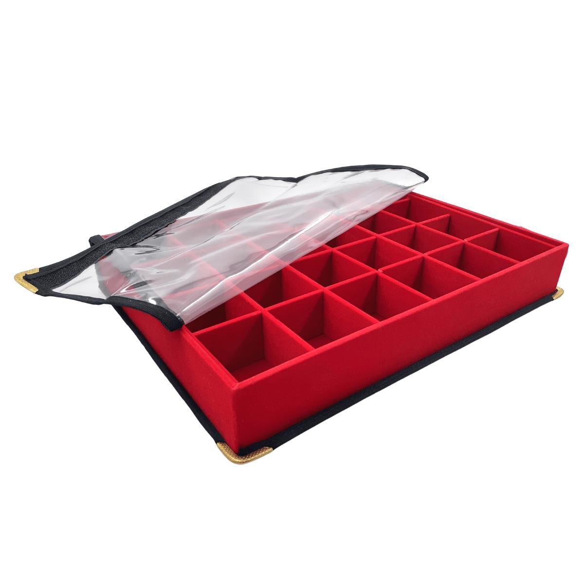 Bandeja grande alta com 24 quadriculados, confeccionada em material MDF (não em papelão) de primeira linha, com acabamento todo revestido em tecido aveludado ou corino em diversas cores, ideal para exposição e organização de suas jóias e semi jóias, evitando danos e riscos as suas peças, protegendo seu banho e destacando a beleza de suas jóias sem perder a elegância!