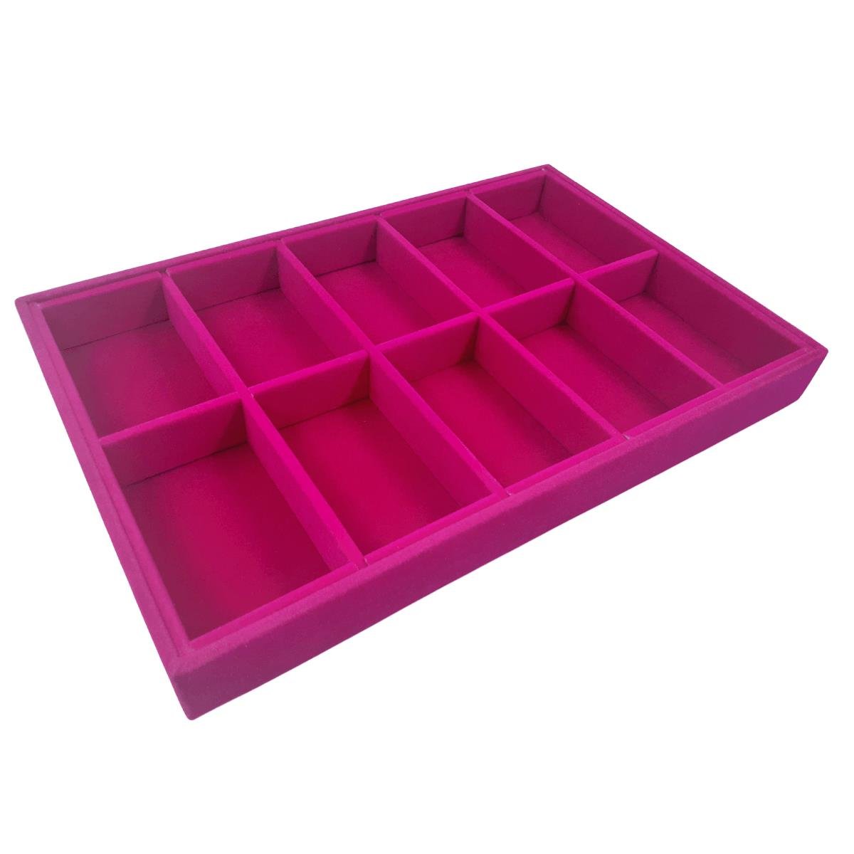Bandeja média com 10 quadriculados, confeccionada em material MDF (não em papelão) de primeira linha, com acabamento todo revestido em tecido aveludado ou corino em diversas cores, ideal para exposição e organização de suas jóias e semi jóias, evitando danos e riscos as suas peças, protegendo seu banho e destacando a beleza de suas jóias sem perder a elegância!