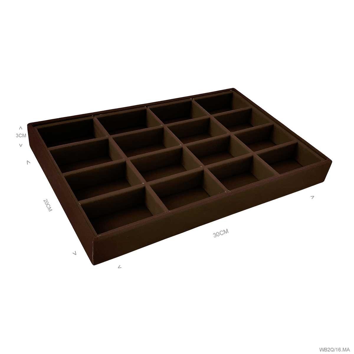 Bandeja média com 16 quadriculados, confeccionada em material MDF (não em papelão) de primeira linha, contém 16 quadriculados com acabamento todo revestido em tecido aveludado ou corino em diversas cores, ideal para exposição e organização de suas jóias e semi jóias, evitando danos e riscos as suas peças, protegendo seu banho e destacando a beleza de suas jóias sem perder a elegância!