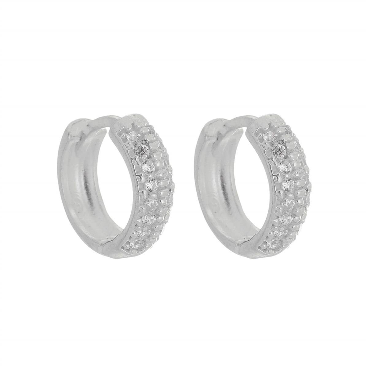 Produzido em prata de alta durabilidade, este brinco possui um design moderno e versátil, perfeito para complementar qualquer look. Sua estrutura em formato de argola, cravejada com delicadas pedras, confere um toque de brilho e glamour à peça.