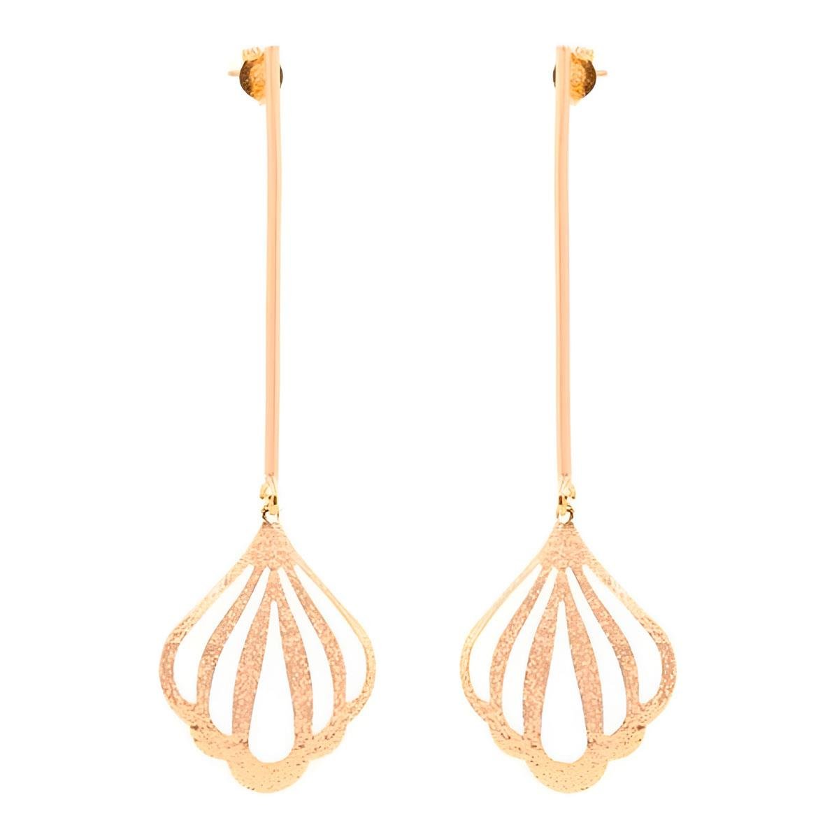 Brinco fioo com chapa concha vazada Banho: Folheado à ouro Tamanho: Médio Material: Latão Medidas aproximadas Altura: 7,6cm Largura base: 1,0mm Largura: 2,3cm Peso: 4,6g. REF.: BO-25929: