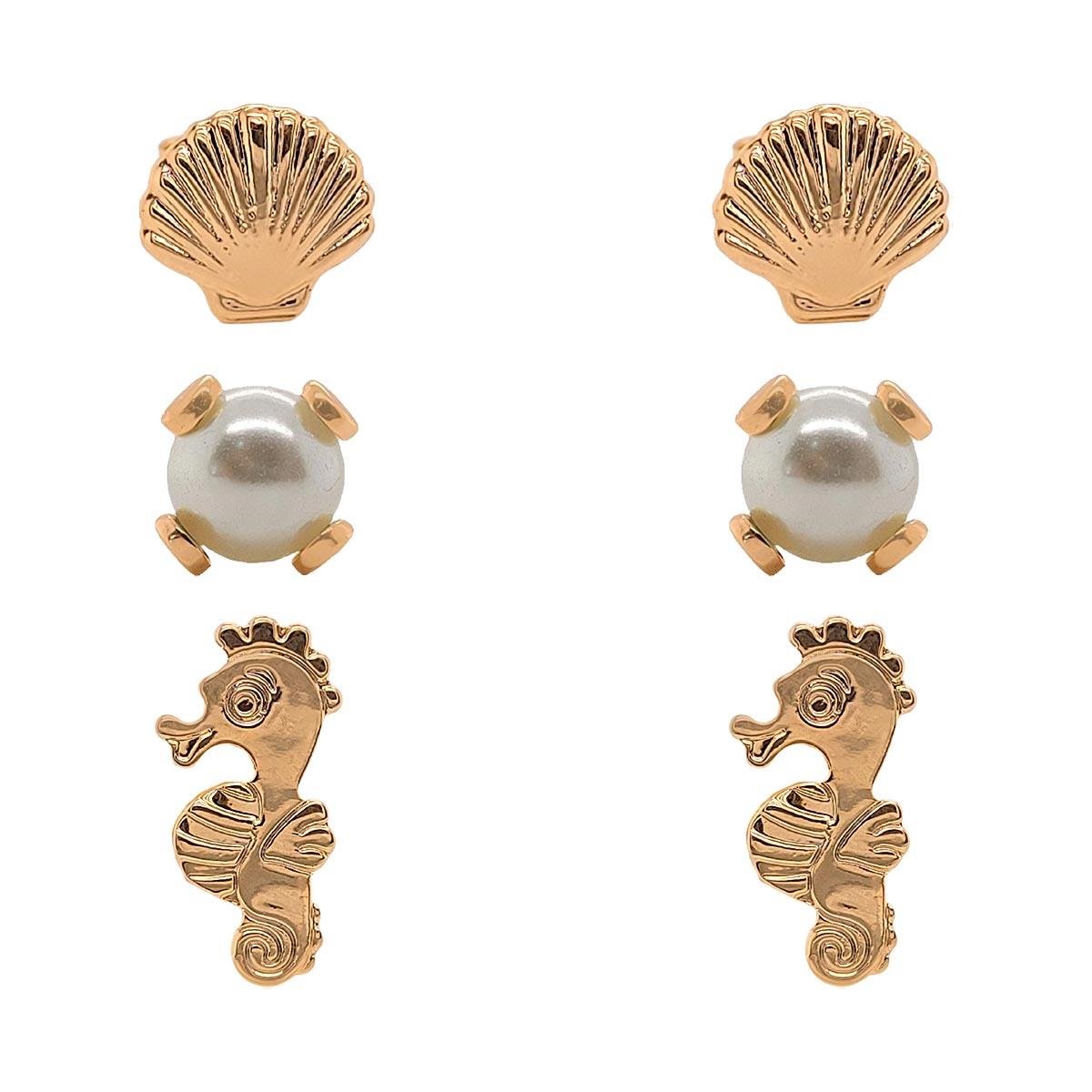 Brinco trio pérola, concha e cavalo marinho