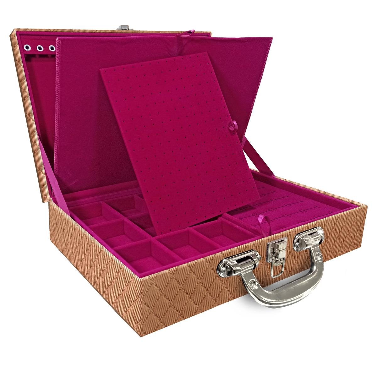 Maleta Dupla Grande Dijon Cobre Metalizado Com Alça Cromada e Imã Maleta estojo dupla grande organizadora de jóias, confeccionada em material MDF (não em papelão) com revestimento externo em couro sintético e interno com tecido aveludado de 1ª linha, fazendo seu produto ter maior durabilidade valorizando e protegendo suas peças com estilo. Contém: - Espuma em corte H com suporte para aproximadamente 32 anéis; - Placa organizadora para aproximadamente 105 pares de brincos; - Aproximadamente 18 suportes para pulseiras ou correntes; - 9 quadriculados (medidas aproximadas 5cm x 6,5cm ) para demais jóias; - 9 quadriculados (medidas aproximadas 11cm x 7cm ) para demais jóias; - Tampa imã; - Fecho cromado com suporte para cadeado; - Alça cromada. Medidas Aproximadas: Altura: 9cm Largura: 24cm Comprimento: 36cm Peso: 2000g WMA10/IC-DJCM