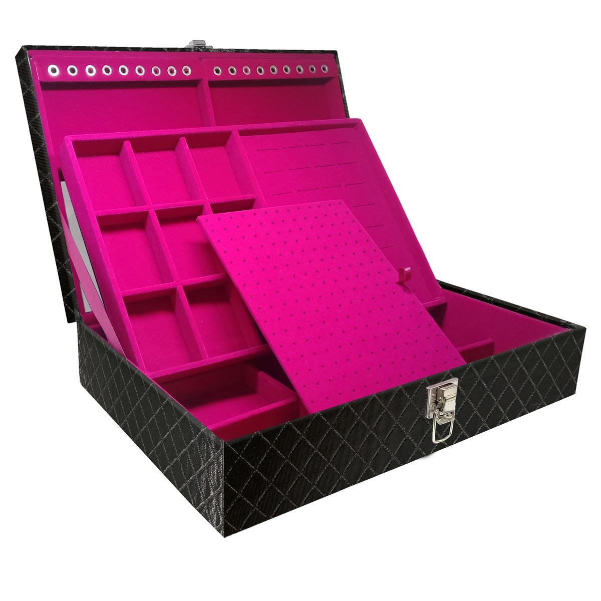 Maleta estojo dupla grande organizadora de jóias, confeccionada em material MDF (não em papelão) com revestimento externo em couro sintético e interno com tecido aveludado de 1ª linha, fazendo seu produto ter maior durabilidade valorizando e protegendo suas peças com estilo. Contém: - Espelho pequeno (medidas aproximadas 16cm x 12cm ); - Espuma em corte H com suporte para aproximadamente 32 anéis; - Placa organizadora para aproximadamente 105 pares de brincos; - Aproximadamente 18 suportes para pulseiras ou correntes; - 9 quadriculados (medidas aproximadas 5cm x 6,5cm ) para demais jóias; - 9 quadriculados (medidas aproximadas 11cm x 7cm ) para demais jóias; - Fecho cromado. Medidas Aproximadas: Altura: 9cm Largura: 24cm Comprimento: 36cm Peso: 2000g WMA10/SA-DPRM