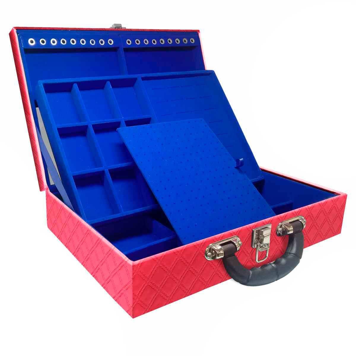 Maleta Dupla Grande Channel Pink Com Alça Preta e Espelho Maleta estojo dupla grande organizadora de jóias, confeccionada em material MDF (não em papelão) com revestimento externo em couro sintético e interno com tecido aveludado de 1ª linha, fazendo seu produto ter maior durabilidade valorizando e protegendo suas peças com estilo. Contém: - Espelho pequeno (medidas aproximadas 16cm x 12cm ); - Espuma em corte H com suporte para aproximadamente 32 anéis; - Placa organizadora para aproximadamente 105 pares de brincos; - Aproximadamente 18 suportes para pulseiras ou correntes; - 9 quadriculados (medidas aproximadas 5cm x 6,5cm ) para demais jóias; - 9 quadriculados (medidas aproximadas 11cm x 7cm ) para demais jóias; - Fecho cromado com suporte para cadeado; - Alça preta. Medidas Aproximadas: Altura: 9cm Largura: 24cm Comprimento: 36cm Peso: 2000g WMA10-CNPIM