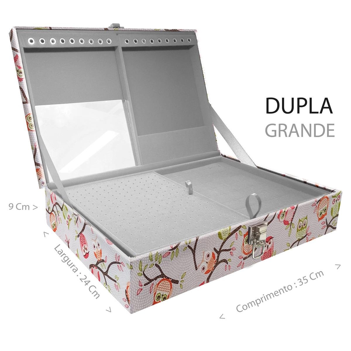 Maleta estojo dupla grande organizadora de jóias, confeccionada em material MDF (não em papelão) com revestimento externo em couro sintético e interno com tecido aveludado de 1ª linha, fazendo seu produto ter maior durabilidade valorizando e protegendo suas peças com estilo. Contém: - Espelho pequeno (medidas aproximadas 16cm x 12cm ); - Espuma em corte H com suporte para aproximadamente 32 anéis; - Placa organizadora para aproximadamente 105 pares de brincos; - Aproximadamente 18 suportes para pulseiras ou correntes; - 9 quadriculados (medidas aproximadas 5cm x 6,5cm ) para demais jóias; - 9 quadriculados (medidas aproximadas 11cm x 7cm ) para demais jóias; - Fecho cromado.