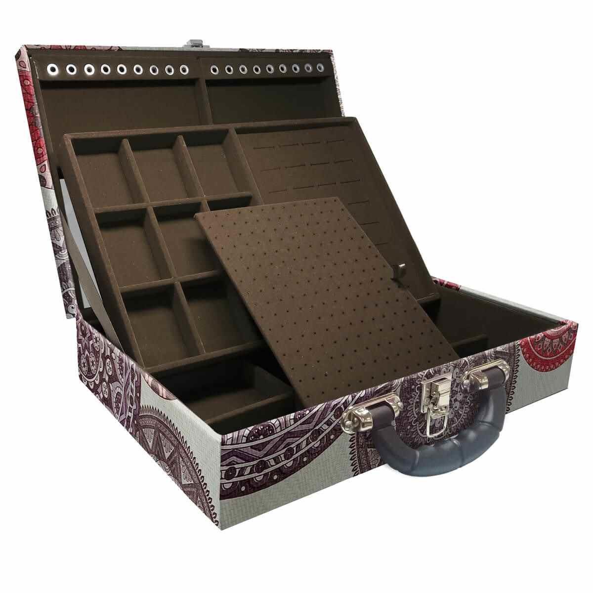 Maleta Dupla Grande Mandala Bege Com Alça Preta e Espelho Maleta estojo dupla grande organizadora de jóias, confeccionada em material MDF (não em papelão) com revestimento externo em couro sintético e interno com tecido aveludado de 1ª linha, fazendo seu produto ter maior durabilidade valorizando e protegendo suas peças com estilo. Contém: - Espelho pequeno (medidas aproximadas 16cm x 12cm ); - Espuma em corte H com suporte para aproximadamente 32 anéis; - Placa organizadora para aproximadamente 105 pares de brincos; - Aproximadamente 18 suportes para pulseiras ou correntes; - 9 quadriculados (medidas aproximadas 5cm x 6,5cm ) para demais jóias; - 9 quadriculados (medidas aproximadas 11cm x 7cm ) para demais jóias; - Fecho cromado; - Alça preta. Medidas Aproximadas: Altura: 9cm Largura: 24cm Comprimento: 36cm Peso: 2000g REF : WMA10-MABE