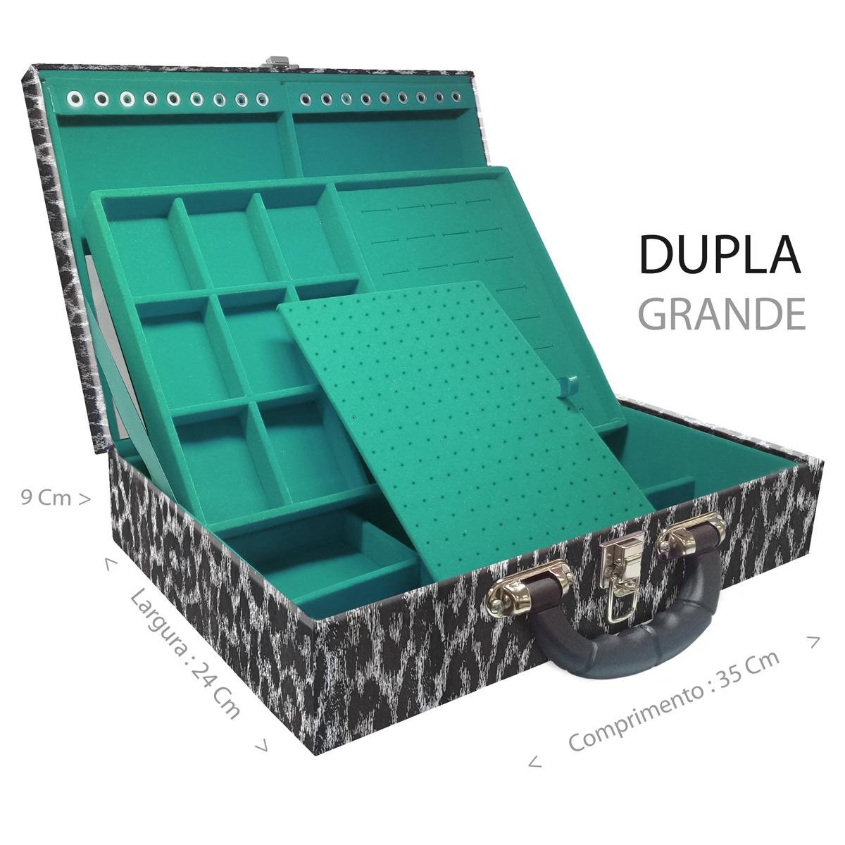 Maleta Dupla Grande Onça Preta Com Alça Preta e Espelho Maleta estojo dupla grande organizadora de jóias, confeccionada em material MDF (não em papelão) com revestimento externo em couro sintético e interno com tecido aveludado de 1ª linha, fazendo seu produto ter maior durabilidade valorizando e protegendo suas peças com estilo. Contém: - Espelho pequeno (medidas aproximadas 16cm x 12cm ); - Espuma em corte H com suporte para aproximadamente 32 anéis; - Placa organizadora para aproximadamente 105 pares de brincos; - Aproximadamente 18 suportes para pulseiras ou correntes; - 9 quadriculados (medidas aproximadas 5cm x 6,5cm ) para demais jóias; - 9 quadriculados (medidas aproximadas 11cm x 7cm ) para demais jóias; - Fecho cromado com suporte para cadeado; - Alça preta. Medidas Aproximadas: Altura: 9cm Largura: 24cm Comprimento: 36cm Peso: 2000g.