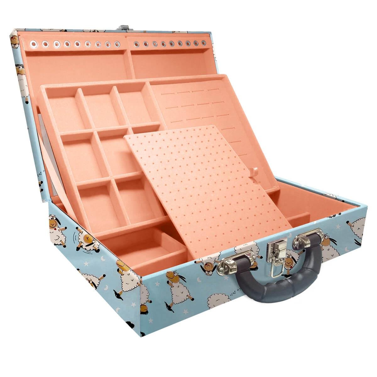 Maleta Dupla Grande Ovelha Azul Com Alça Preta e Espelho Maleta estojo dupla grande organizadora de jóias, confeccionada em material MDF (não em papelão) com revestimento externo em couro sintético e interno com tecido aveludado de 1ª linha, fazendo seu produto ter maior durabilidade valorizando e protegendo suas peças com estilo. Contém: - Espelho pequeno (medidas aproximadas 16cm x 12cm ); - Espuma em corte H com suporte para aproximadamente 32 anéis; - Placa organizadora para aproximadamente 105 pares de brincos; - Aproximadamente 18 suportes para pulseiras ou correntes; - 9 quadriculados (medidas aproximadas 5cm x 6,5cm ) para demais jóias; - 9 quadriculados (medidas aproximadas 11cm x 7cm ) para demais jóias; - Fecho cromado; - Alça preta. Medidas Aproximadas: Altura: 9cm Largura: 24cm Comprimento: 36cm Peso: 2000g REF.: WMA10-OVAZ:
