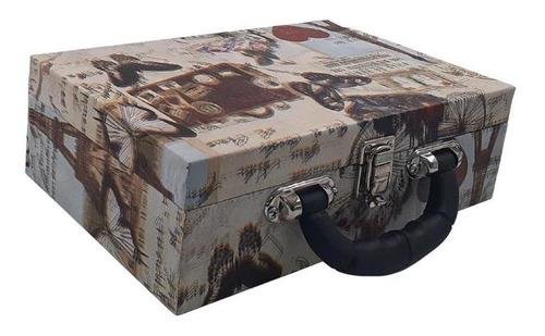 Maleta estojo dupla média organizadora de jóias, confeccionada em material MDF (não em papelão) com revestimento externo em couro sintético e interno com tecido aveludado de 1ª linha, fazendo seu produto ter maior durabilidade valorizando e protegendo suas peças com estilo. Contém: - Aproximadamente 14 suportes para pulseiras ou correntes; - Espelho pequeno (medidas aproximadas 13cm x 8,5cm ); - Espuma em corte H com suporte para aproximadamente 32 anéis; - Placa organizadora para aproximadamente 60 pares de brincos; - 9 quadriculados (medidas aproximadas 3,5cm x 4,5cm ) para demais jóias; - 9 quadriculados (medidas aproximadas 8,5cm x 6cm ) para demais jóias; - Alça plastica; - Fecho cromado. Medidas Aproximadas: Altura: 9cm Largura: 18cm Comprimento: 28cm Peso: 1400g. REF.:WMA9-PARR