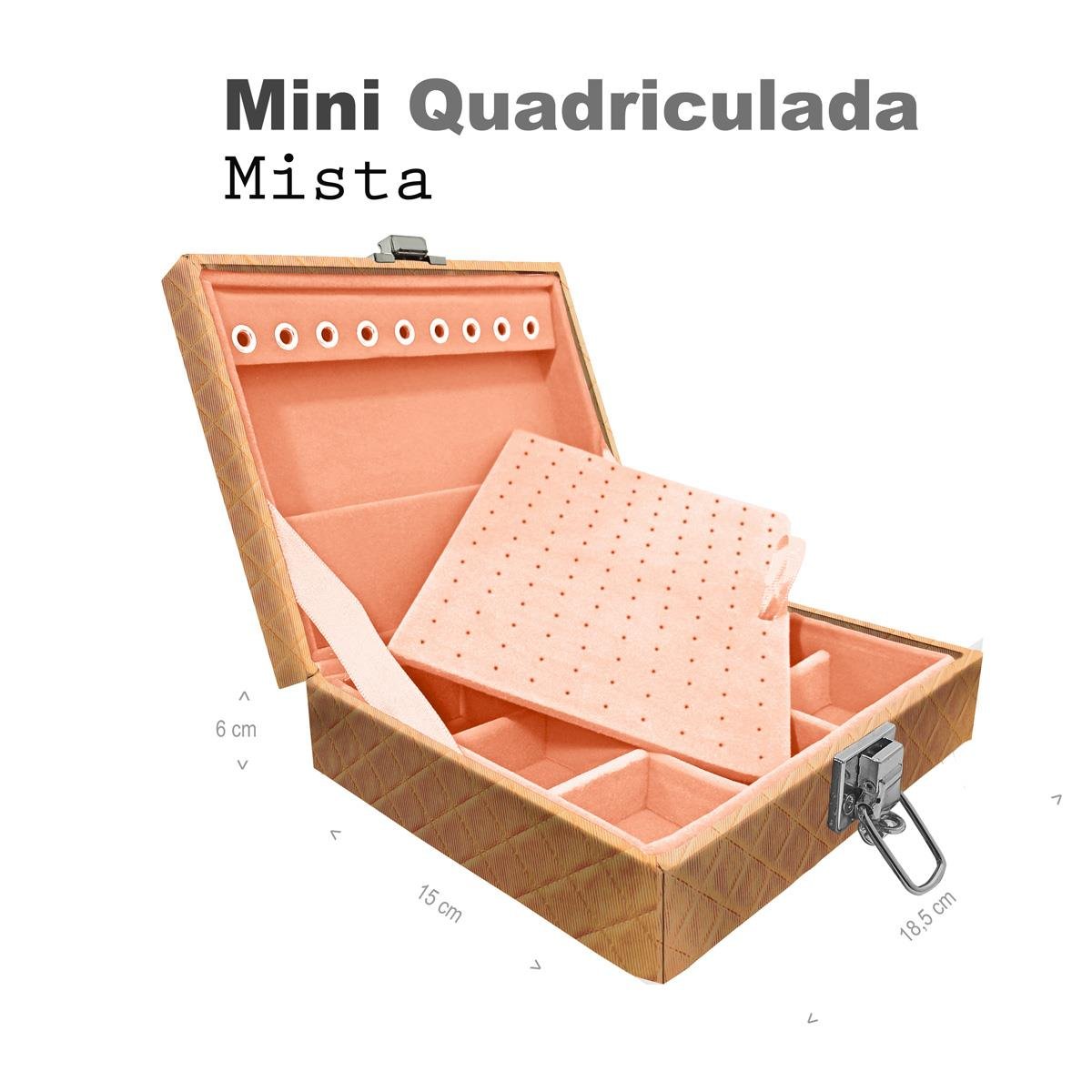 Estojo Maleta Porta Jóias Mini, confeccionada em material MDF (não em papelão) com revestimento externo em couro sintético e interno com tecido aveludado de 1ª linha, fazendo seu produto ter maior durabilidade valorizando e protegendo suas peças com estilo. Contém: - Aproximadamente 9 ilhós para correntes, pingentes ou pulseiras;- Placa organizadora para brincos com aproximadamente 65 pares de brincos (medidas aproximadas 16cm x 13 cm );- 9 quadriculados (medidas aproximadas 5cm x 4 cm ) para demais jóias;- Fecho cromado. - .: