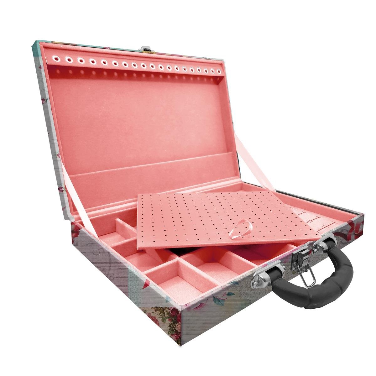 Maleta Simples Grande Angel Com Alça Preta Maleta estojo simples grande organizadora de jóias, confeccionada em material MDF (não em papelão) com revestimento externo em couro sintético e interno com tecido aveludado de 1ª linha, fazendo seu produto ter maior durabilidade valorizando e protegendo suas peças com estilo. Contém: - Aproximadamente 19 suportes para pulseiras ou correntes; - Espuma em corte H com suporte para aproximadamente 40 anéis; - Placa organizadora para aproximadamente 117 pares de brincos; - 9 quadriculados (medidas aproximadas 7cm x5cm ) para demais jóias; - Alça plastica; - Fecho cromado. Medidas Aproximadas: Altura: 6cm Largura: 24cm Comprimento: 35cm Peso: 1350g: