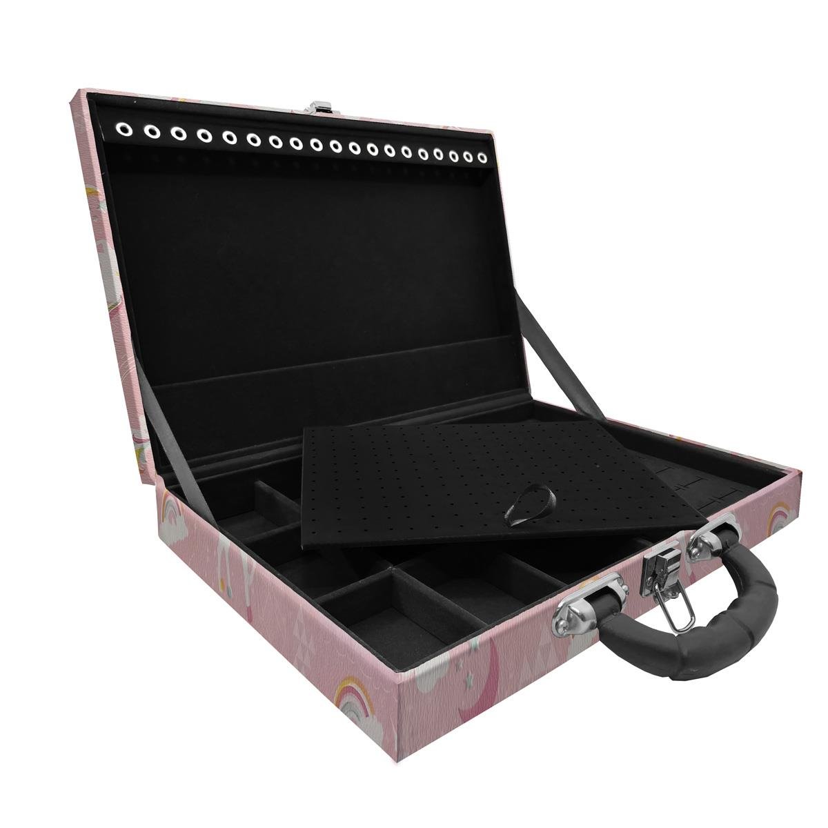 Estojo Maleta Porta Jóias Simples Grande Unicórnio Rosa Com Alça Preta Maleta estojo simples grande organizadora de jóias, confeccionada em material MDF (não em papelão) com revestimento externo em couro sintético e interno com tecido aveludado de 1ª linha, fazendo seu produto ter maior durabilidade valorizando e protegendo suas peças com estilo. Contém: - Aproximadamente 19 suportes para pulseiras ou correntes; - Espuma em corte H com suporte para aproximadamente 40 anéis; - Placa organizadora para aproximadamente 117 pares de brincos; - 9 quadriculados (medidas aproximadas 7cm x5cm ) para demais jóias; - Alça plastica; - Fecho cromado. Medidas Aproximadas: Altura: 6cm Largura: 24cm Comprimento: 35cm Peso: 1350g: