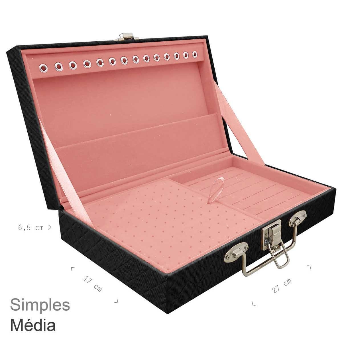 Estojo Maleta Porta Jóias Simples Média Dijon Preto Estojo Maleta Porta Jóias simples média organizadora de jóias, confeccionada em material MDF (não em papelão) com revestimento externo em couro sintético e interno com tecido aveludado de 1ª linha, fazendo seu produto ter maior durabilidade valorizando e protegendo suas peças com estilo. Contém: - Espuma em corte H com suporte para aproximadamente 32 anéis; - Placa organizadora para aproximadamente 60 pares de brincos; - Aproximadamente 14 suportes para pulseiras ou correntes; - 9 quadriculados (medidas aproximadas 5cm x 4cm ) para demais jóias; - Alça fina cromada; - Fecho cromado. Medidas Aproximadas: Altura: 7cm Largura: 17cm Comprimento: 27cm Peso: 850g: