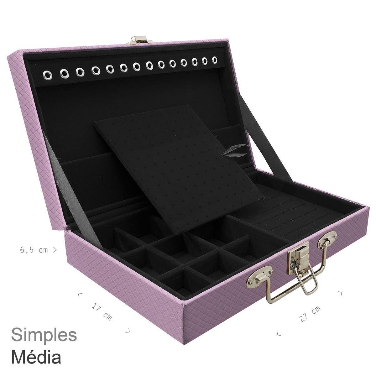Estojo Maleta Porta Jóias Simples Média Ladrilhado Lilás Estojo Maleta Porta Jóias simples média organizadora de jóias, confeccionada em material MDF (não em papelão) com revestimento externo em couro sintético e interno com tecido aveludado de 1ª linha, fazendo seu produto ter maior durabilidade valorizando e protegendo suas peças com estilo. Contém: - Espuma em corte H com suporte para aproximadamente 32 anéis; - Placa organizadora para aproximadamente 60 pares de brincos; - Aproximadamente 14 suportes para pulseiras ou correntes; - 9 quadriculados (medidas aproximadas 5cm x 4cm ) para demais jóias; - Alça fina cromada; - Fecho cromado. Medidas Aproximadas: Altura: 7cm Largura: 17cm Comprimento: 27cm Peso: 850g WMA22-LIL: