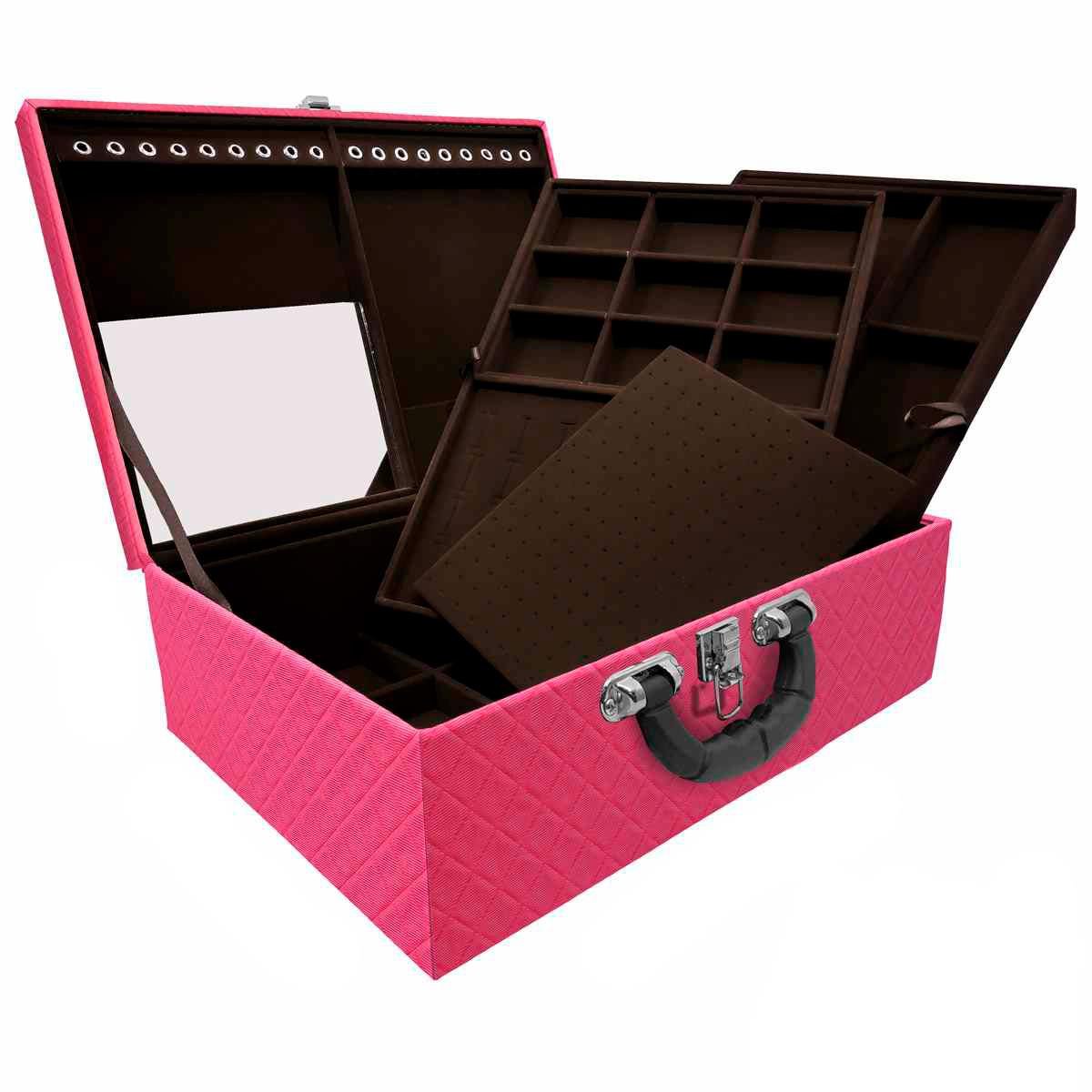 Estojo Maleta Porta Joias Triplo Grande Dijon Pink com Alça Preta e Espelho Estojo Maleta Porta Jóias Triplo tripla grande organizadora de jóias, confeccionada em material MDF (não em papelão) com revestimento externo em couro sintético e interno com tecido aveludado de 1ª linha, fazendo seu produto ter maior durabilidade valorizando e protegendo suas peças com estilo. Contém: - Espelho pequeno (medidas aproximadas 16cm x 12cm ); - Aproximadamente 18 suportes para pulseiras ou correntes; - 9 quadriculados (medidas aproximadas 11cm x 8cm ) para demais jóias; - Fecho cromado; - Alça plastica. - 01 bandeja mista (medidas aproximadas 33cm x 22cm x 3cm ) com: - Espuma em corte H com suporte para aproximadamente 32 anéis; - Placa organizadora para aproximadamente 105 pares de brincos; - 9 quadriculados (medidas aproximadas 6,5cm x 4,5cm ) para demais jóias; - 01 bandeja (medidas aproximadas 33cm x 22cm x 3cm ) com 9 quadriculados (medidas aproximadas 10cm x 6,5cm ) para demais jóias . Medidas Aproximadas: Altura: 12 cm Largura: 24 cm Comprimento: 35 cm Peso: 2600g. WMA76-DPI