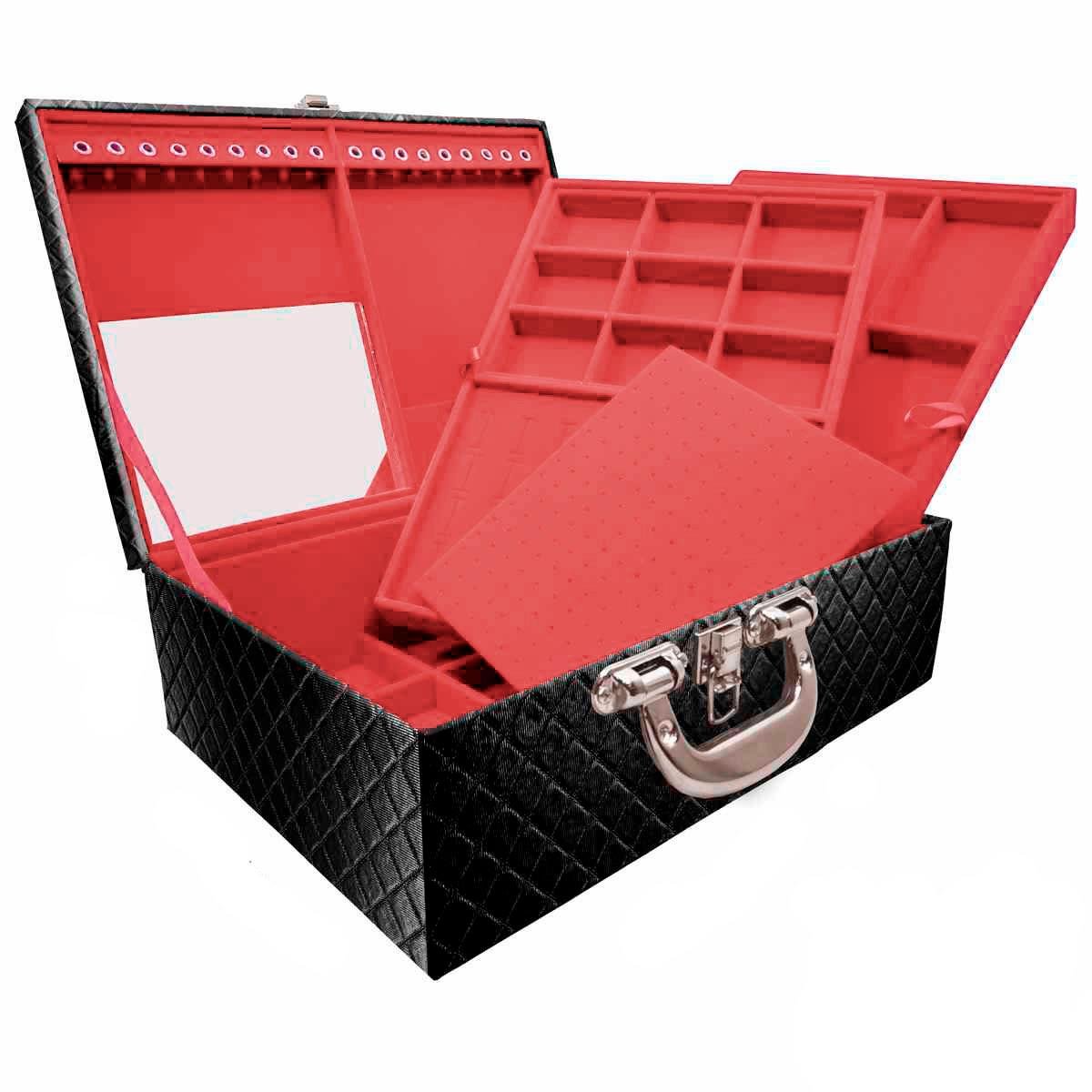Maleta Tripla Grande Jacaré Com Alça Cromada e EspelhoEstojo Maleta Porta Jóias Triplo tripla grande organizadora de jóias, confeccionada em material MDF (não em papelão) com revestimento externo em couro sintético e interno com tecido aveludado de 1ª linha, fazendo seu produto ter maior durabilidade valorizando e protegendo suas peças com estilo.