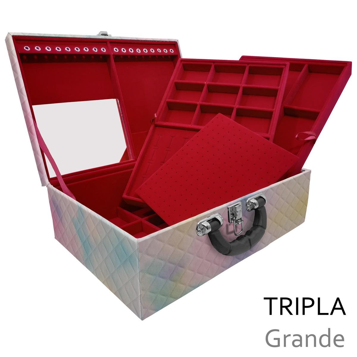 Estojo Maleta Porta Jóias Triplo tripla grande organizadora de jóias, confeccionada em material MDF (não em papelão) com revestimento externo em couro sintético e interno com tecido aveludado de 1ª linha, fazendo seu produto ter maior durabilidade valorizando e protegendo suas peças com estilo. Contém: - Espelho pequeno (medidas aproximadas 16cm x 12cm ); - Aproximadamente 18 suportes para pulseiras ou correntes; - 9 quadriculados (medidas aproximadas 11cm x 8cm ) para demais jóias; - Fecho cromado; - Alça plastica. - 01 bandeja mista (medidas aproximadas 33cm x 22cm x 3cm ) com: - Espuma em corte H com suporte para aproximadamente 32 anéis; - Placa organizadora para aproximadamente 105 pares de brincos; - 9 quadriculados (medidas aproximadas 6,5cm x 4,5cm ) para demais jóias. - 01 bandeja (medidas aproximadas 33cm x 22cm x 3cm ) com 9 quadriculados (medidas aproximadas 10cm x 6,5cm ) para demais jóias. - .: