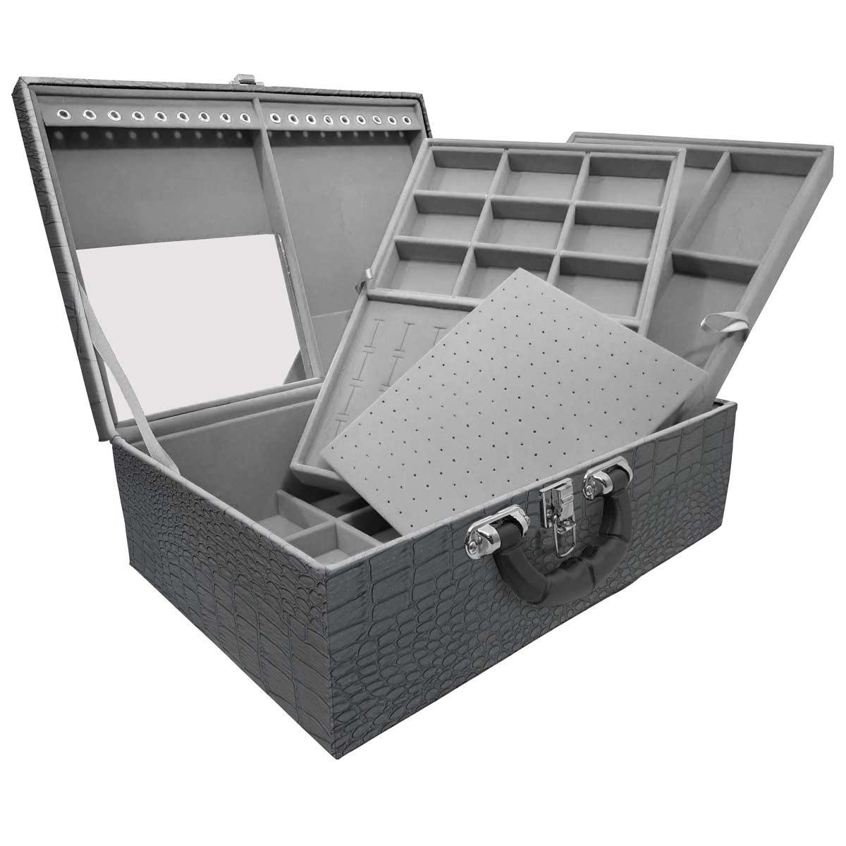 Maleta Tripla Grande Dinossauro Com Alça Preta e Espelho Estojo Maleta Porta Jóias Triplo tripla grande organizadora de jóias, confeccionada em material MDF (não em papelão) com revestimento externo em couro sintético e interno com tecido aveludado de 1ª linha, fazendo seu produto ter maior durabilidade valorizando e protegendo suas peças com estilo. Contém: - Espelho pequeno (medidas aproximadas 16cm x 12cm ); - Aproximadamente 18 suportes para pulseiras ou correntes; - 9 quadriculados (medidas aproximadas 11cm x 8cm ) para demais jóias; - Fecho cromado; - Alça plastica. - 01 bandeja mista (medidas aproximadas 33cm x 22cm x 3cm ) com: - Espuma em corte H com suporte para aproximadamente 32 anéis; - Placa organizadora para aproximadamente 105 pares de brincos; - 9 quadriculados (medidas aproximadas 6,5cm x 4,5cm ) para demais jóias; - 01 bandeja (medidas aproximadas 33cm x 22cm x 3cm ) com 9 quadriculados (medidas aproximadas 10cm x 6,5cm ) para demais jóias . Medidas Aproximadas: Altura: 13 cm Largura: 24 cm Comprimento: 35 cm Peso: 2600g. WMA76-DINO