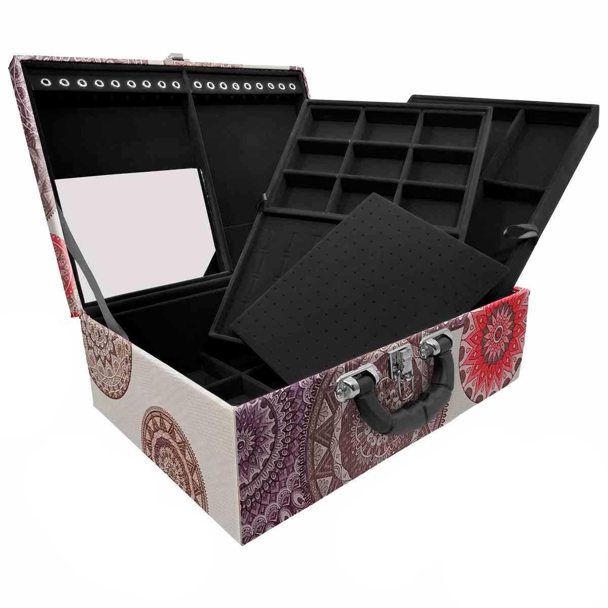 Maleta Tripla Grande Mandala Bege Com Alça Preta e Espelho Estojo Maleta Porta Jóias Triplo tripla grande organizadora de jóias, confeccionada em material MDF (não em papelão) com revestimento externo em couro sintético e interno com tecido aveludado de 1ª linha, fazendo seu produto ter maior durabilidade valorizando e protegendo suas peças com estilo. Contém: - Espelho pequeno (medidas aproximadas 16cm x 12cm ); - Aproximadamente 18 suportes para pulseiras ou correntes; - 9 quadriculados (medidas aproximadas 11cm x 8cm ) para demais jóias; - Fecho cromado; - Alça plastica. - 01 bandeja mista (medidas aproximadas 33cm x 22cm x 3cm ) com: - Espuma em corte H com suporte para aproximadamente 32 anéis; - Placa organizadora para aproximadamente 105 pares de brincos; - 9 quadriculados (medidas aproximadas 6,5cm x 4,5cm ) para demais jóias; - 01 bandeja (medidas aproximadas 33cm x 22cm x 3cm ) com 9 quadriculados (medidas aproximadas 10cm x 6,5cm ) para demais jóias . Medidas Aproximadas: Altura: 12 cm Largura: 24 cm Comprimento: 35 cm Peso: 2600g. WMA76-MABE: