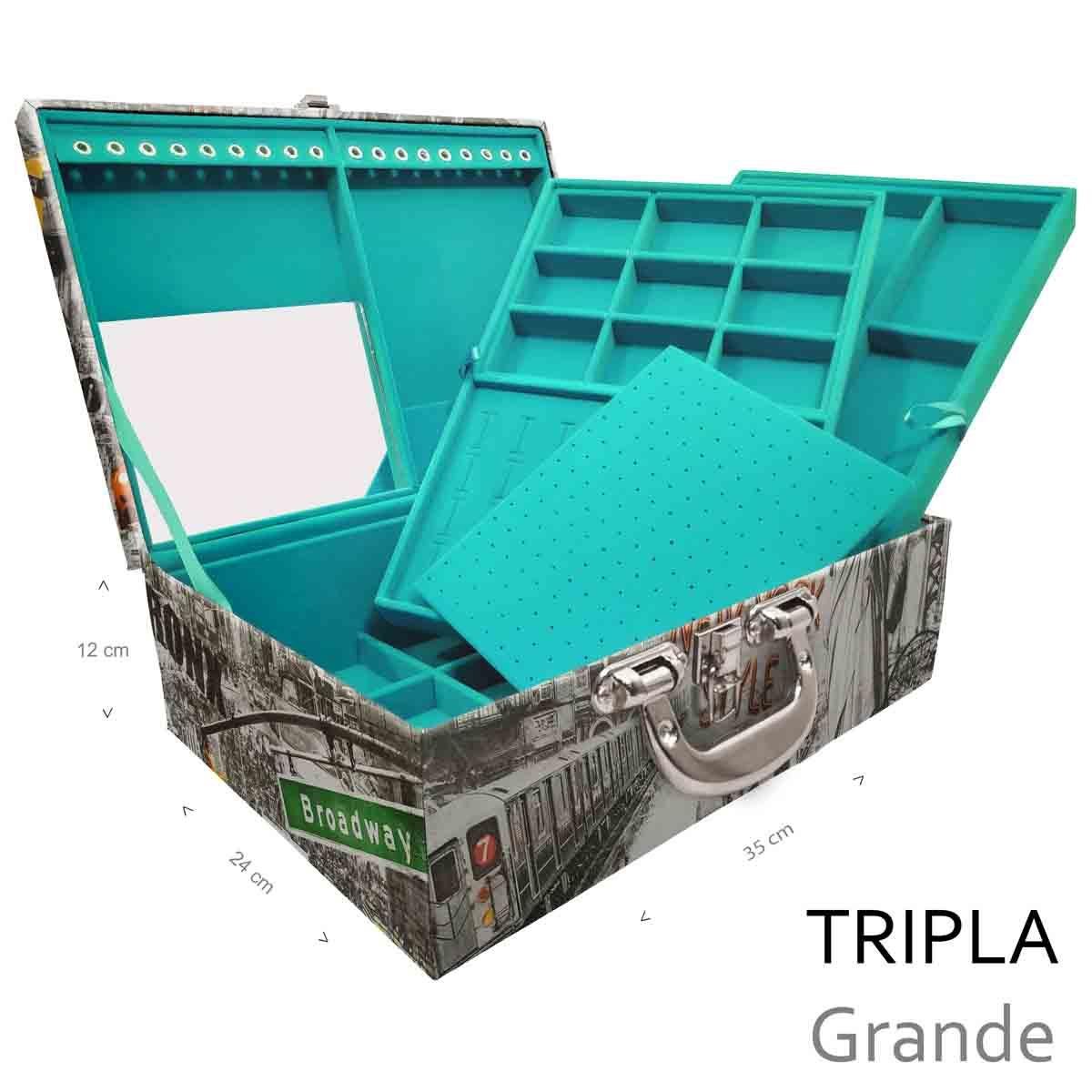 EEstojo Maleta Porta Jóias Triplo Grande New York Táxi Com Alça Cromada e Espelho Estojo Maleta Porta Jóias Triplo tripla grande organizadora de jóias, confeccionada em material MDF (não em papelão) com revestimento externo em couro sintético e interno com tecido aveludado de 1ª linha, fazendo seu produto ter maior durabilidade valorizando e protegendo suas peças com estilo. Contém: - Espelho pequeno (medidas aproximadas 16cm x 12cm ); - Aproximadamente 18 suportes para pulseiras ou correntes; - 9 quadriculados (medidas aproximadas 11cm x 8cm ) para demais jóias; - Fecho cromado; - Alça cromada. - 01 bandeja mista (medidas aproximadas 33cm x 22cm x 3cm ) com: - Espuma em corte H com suporte para aproximadamente 32 anéis; - Placa organizadora para aproximadamente 105 pares de brincos; - 9 quadriculados (medidas aproximadas 6,5cm x 4,5cm ) para demais jóias; - 01 bandeja (medidas aproximadas 33cm x 22cm x 3cm ) com 9 quadriculados (medidas aproximadas 10cm x 6,5cm ) para demais jóias. Medidas Aproximadas: Altura: 13cm Largura: 25cm Comprimento: 35cm Peso: 2600g. REF.: WMA76/C-NY