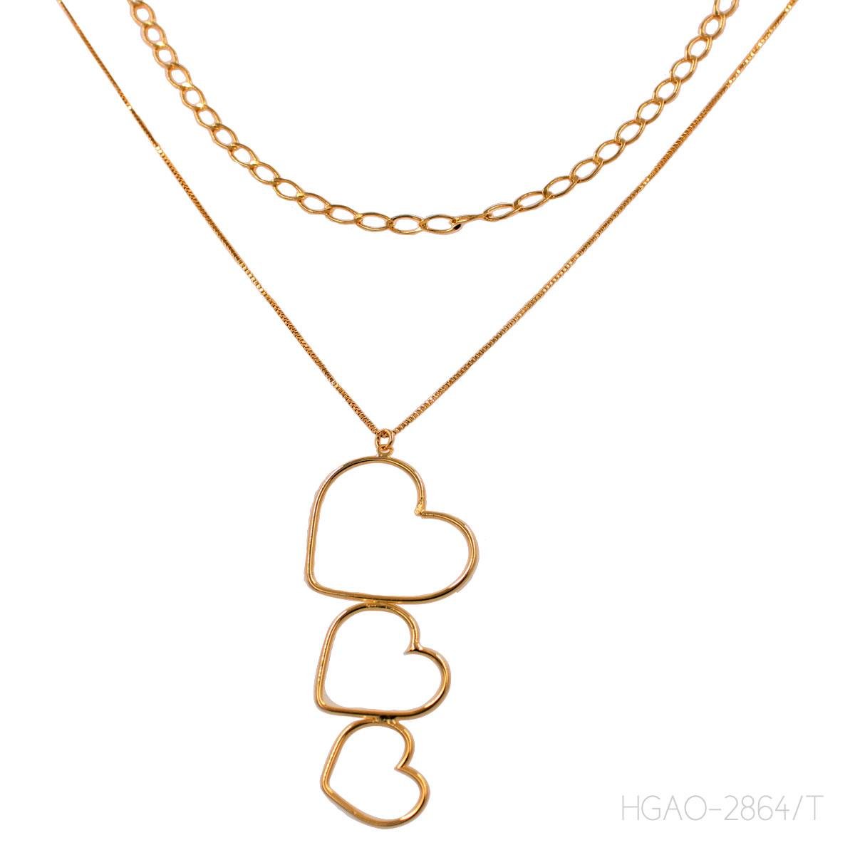 Gargantilhas dupla com 3 corações folheado a ouro. Composta por corrente losango e corrente veneziana com pingente 3 corações. As gargantilhas são ótimas peças para compor um look despojado. Elas podem ser usadas sozinhas ou em um mix de colares. Banho: Folheada a ouro. Medidas aproximadas: Da gargantilha: - comprimento: 18cm - espessura: 1mm Da corrente veneziana: - comprimento: 30cm - espessura: 1mm Do pingente: - comprimento: 6,5 cm - largura: 2,5 cm - altura: 1mm REF.: HGAO-2864/T: