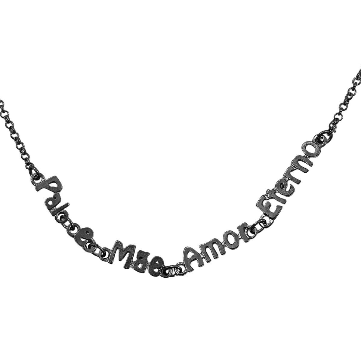 Gargantilha Pai e Mãe Amor Eterno banhada em Ródio Negro. Medidas aproximadas da gargantilha: - comprimento: 45cm - espessura: 1mm Do pingente: - comprimento: 8,5cm - largura: 1mm - altura: 5mm Peso aproximado: 5,5g REF.: HGAG-0896/45: