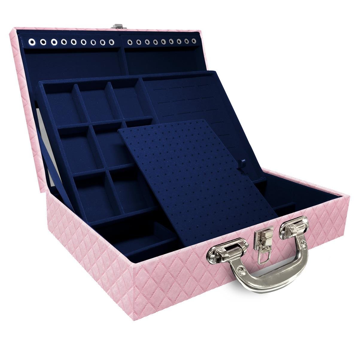 ATENÇÃO: PRODUTO SOB ENCOMENDA - 20 DIAS ÚTEIS PARA FABRICAÇÃO Maleta Dupla Grande Dijon Rosa Bebê Metalizado Com Alça Cromada e Espelho - Sob Encomenda Maleta estojo dupla grande organizadora de jóias, confeccionada em material MDF (não em papelão) com revestimento externo em couro sintético e interno com tecido aveludado de 1ª linha, fazendo seu produto ter maior durabilidade valorizando e protegendo suas peças com estilo. Contém: - Espelho pequeno (medidas aproximadas 16cm x 12cm ); - Espuma em corte H com suporte para aproximadamente 32 anéis; - Placa organizadora para aproximadamente 105 pares de brincos; - Aproximadamente 18 suportes para pulseiras ou correntes; - 9 quadriculados (medidas aproximadas 5cm x 6,5cm ) para demais jóias; - 9 quadriculados (medidas aproximadas 11cm x 7cm ) para demais jóias; - Fecho cromado; - Alça cromada. Medidas Aproximadas: Altura: 9cm Largura: 24cm Comprimento: 36cm Peso: 2000g ENC_WMA10/C-DRBM: