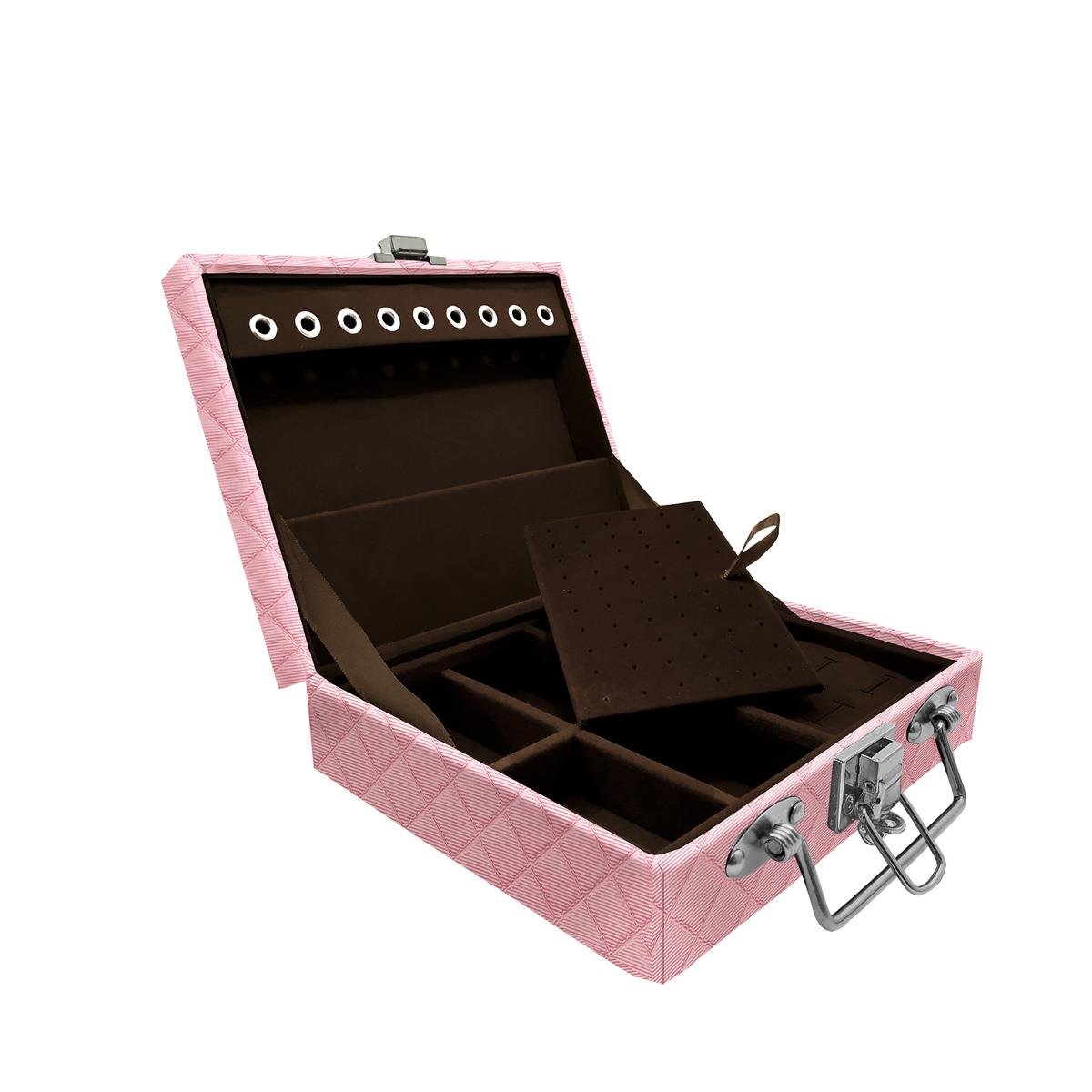 ATENÇÃO: PRODUTO SOB ENCOMENDA - 20 DIAS ÚTEIS PARA FABRICAÇÃO Maleta Mini Mista Dijon Rosa Bebê Metalizado - Sob Encomenda Maleta estojo mini organizadora de jóias, confeccionada em material MDF (não em papelão) com revestimento externo em couro sintético e interno com tecido aveludado de 1ª linha, fazendo seu produto ter maior durabilidade valorizando e protegendo suas peças com estilo. Contém: - Aproximadamente 9 ilhós para correntes, pingentes ou pulseiras; - Placa organizadora para aproximadamente 30 pares de brincos (medidas aproximadas 13cm x 8cm ); - Suporte aproximadamente para 12 anéis (podendo variar de acordo com o tamanho da jóia); - 4 quadriculados (medidas aproximadas 6cm x 3,5cm ) para demais jóias; -Fecho cromado; - Alça fina cromada. Medidas Aproximadas: Altura: 6cm Largura: 15cm Comprimento: 18cm Peso: 660g: