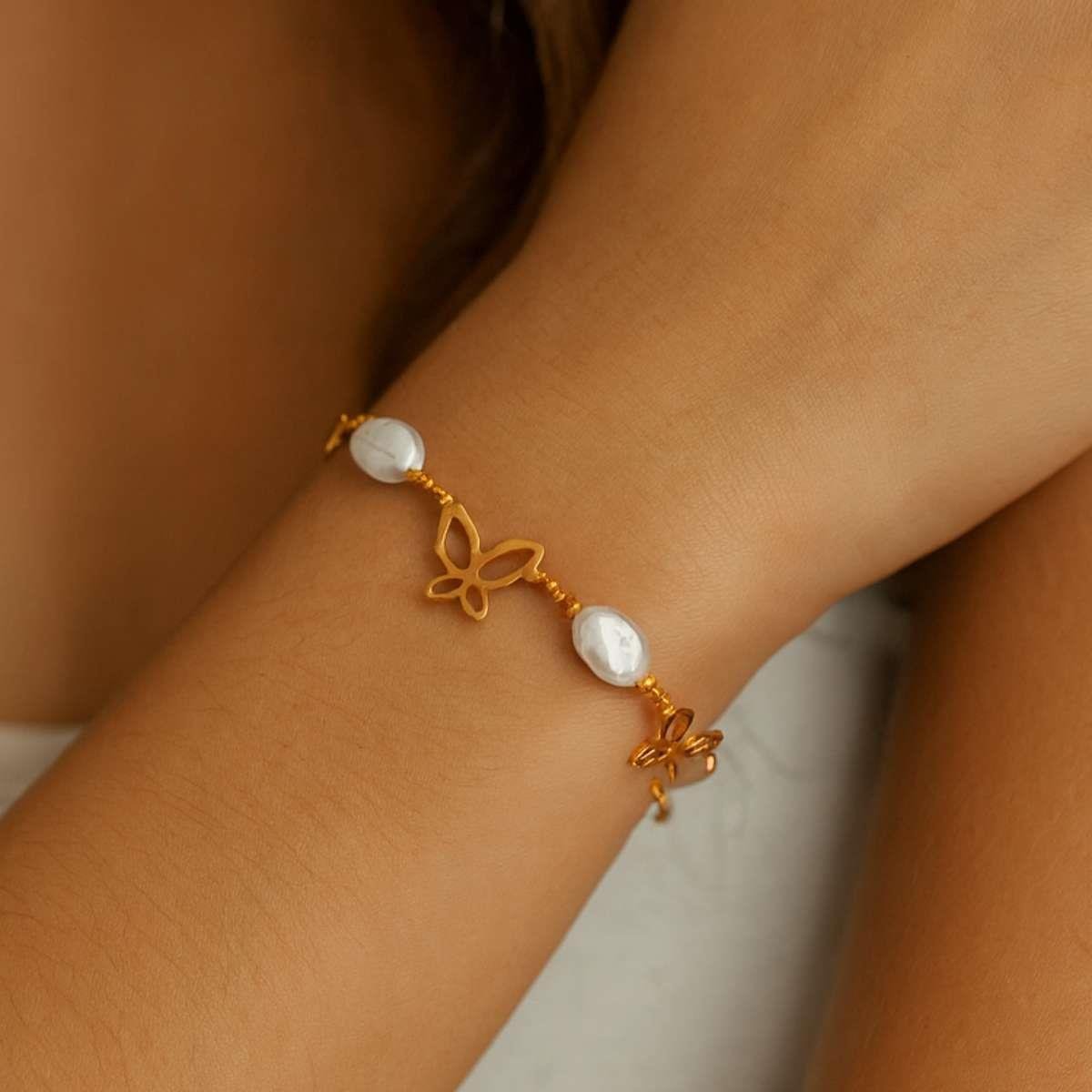 Pulseira Borboletas e Pérolas 18cm Banhado a OuroMaterial: Latão