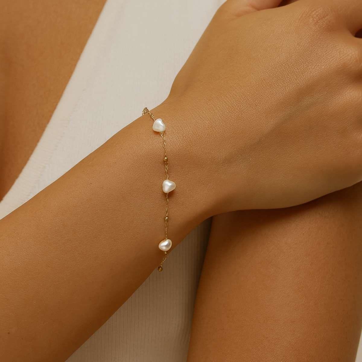 Pulseira Corações de Pérola 18cm Banhado a OuroMaterial: Latão