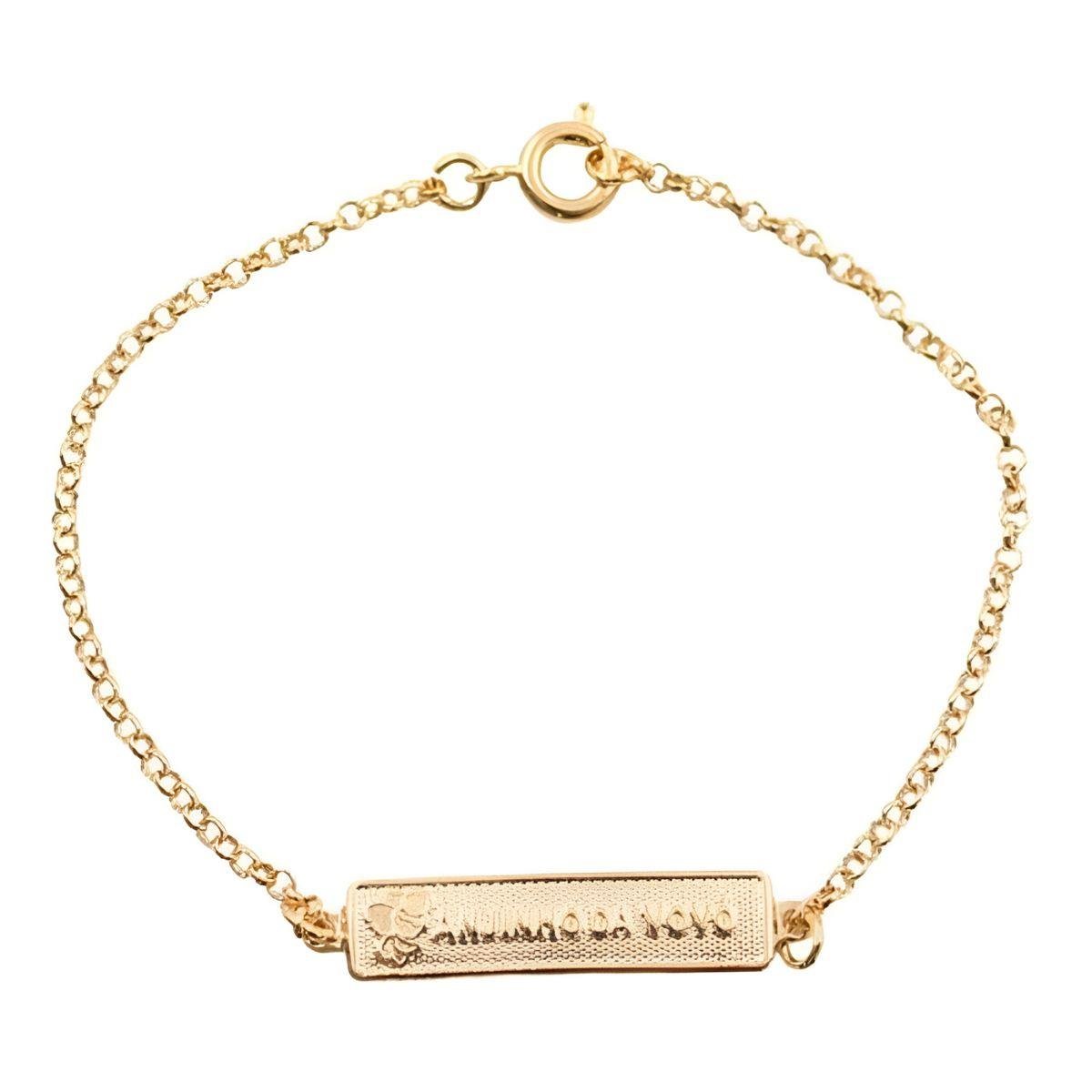 Pulseira infantil com plaquinha anjinho da vovó. Banho: Ouro 18K Tamanho: Médio Material: Latão Medidas aproximadas: Comprimento: 15cm Peso: 1,8g. REF.: HPUO-3565A pulseira de elo português com plaquinha escrito "Anjinho da Vovó", uma peça delicada e elegante que irá encantar os amantes de joias e semi joias. Feita com materiais de alta qualidade, essa pulseira é resistente e durável, além de possuir um acabamento impecável que valoriza ainda mais sua beleza. O elo português é um clássico da joalheria e traz um toque de sofisticação para qualquer look.A plaquinha com a inscrição "Anjinho da Vovó" é um detalhe especial que torna essa pulseira ainda mais única e significativa. É uma ótima opção de presente para avós e netas que desejam demonstrar seu amor e carinho de forma elegante e discreta.Comprar essa pulseira é investir em uma peça atemporal e versátil, que pode ser usada em diversas ocasiões e combinações de estilo. Além disso, ao adquirir nossos produtos online, você conta com a comodidade de receber sua compra no conforto de sua casa.Não perca a oportunidade de ter essa pulseira em sua coleção de joias e semi joias. Adquira já a sua e sinta-se ainda mais bela e elegante.:
