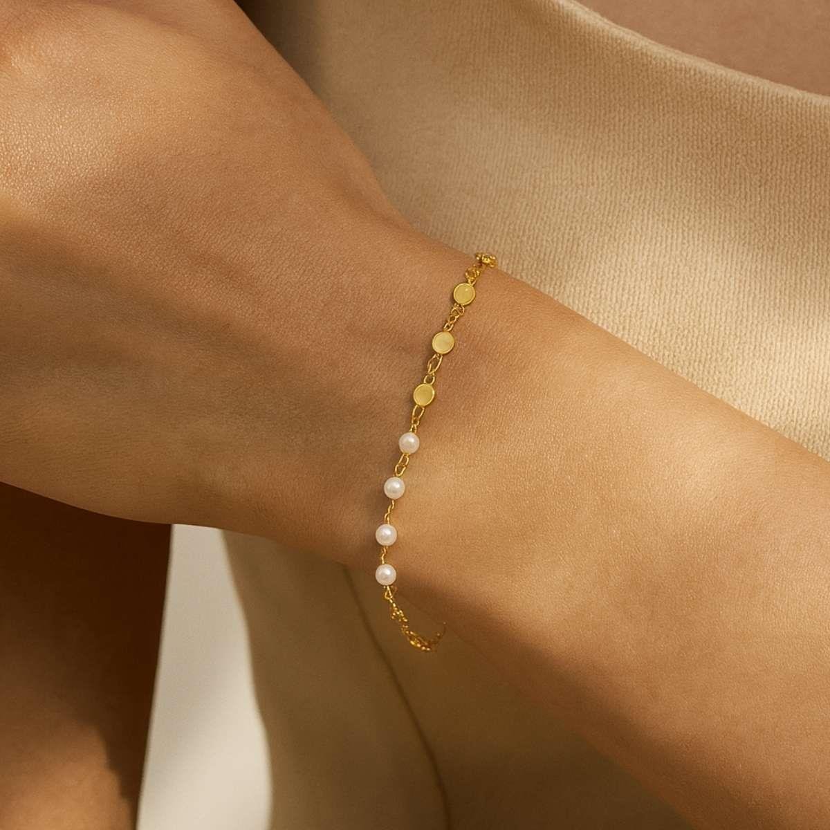 Pulseira Pérolas e Chapinhas 18cm Banhado a OuroMaterial: Latão