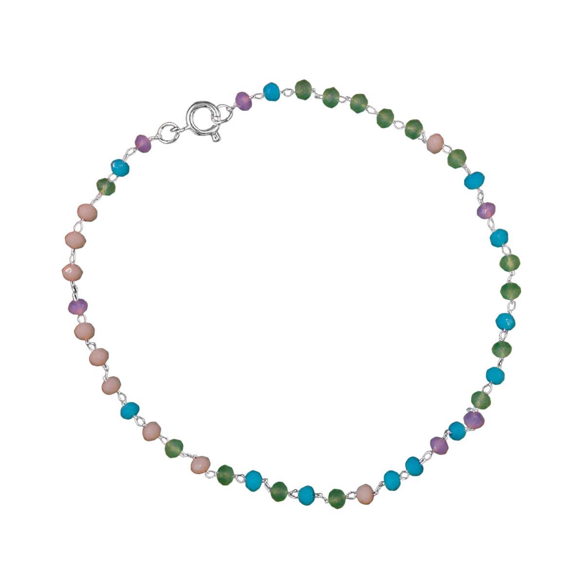 Tornozeleira com Miçangas Coloridas Folheado a Prata Banho: Folheado a prata. Pedra: Acrílica. Fecho: Bóia. Medidas aproximadas: TORNOZELEIRA: - Comprimento: 24cm - Espessura: 2mm REF.: XPLP-2384/24: