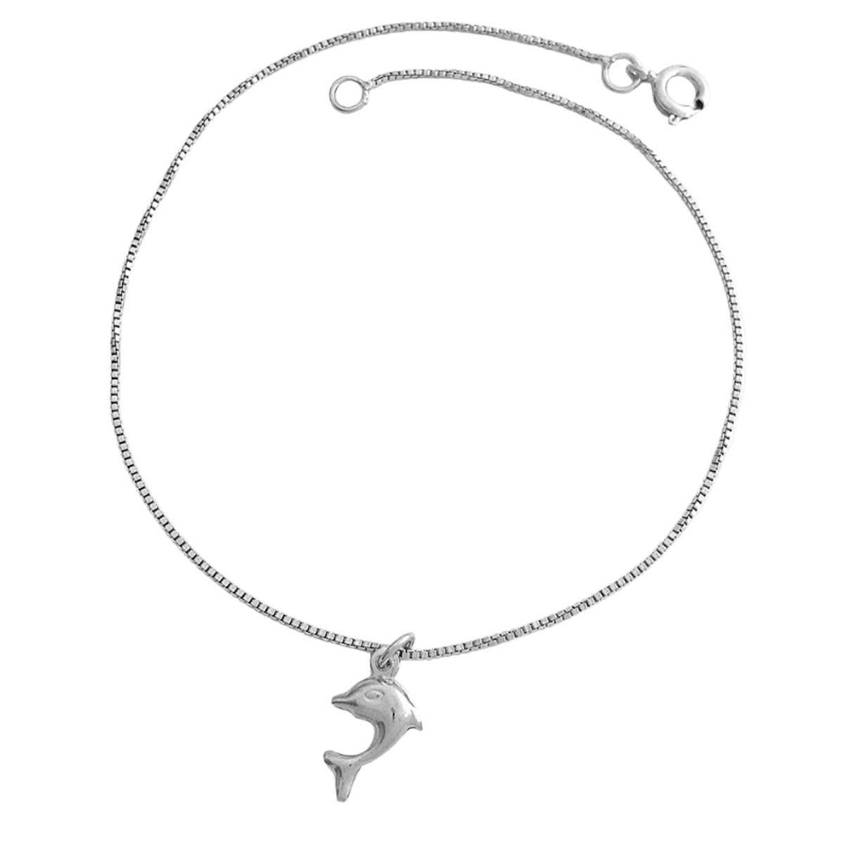 Tornozeleira Veneziana com Golfinho Folheado a Prata Mterialo: Latão Banho: Folheado a prata. Fecho: Bóia. Medidas aproximadas: Tornozeleira: - Comprimento: 23cm - Espessura: 1mm Pingente: - Comprimento: 8mm - Altura: 8mm - Espessura: 3mm REF.: HTOP-4638/24E2: